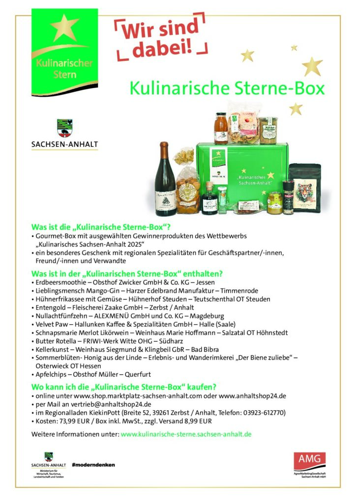 Im Juni 2025 habe ich mit meinem Schnapsmarie Merlot Likörwein zu meiner großen Freude einen kulinarischen Stern von Sachsen-Anhalt in der Kategorie Liköre erhalten. Diesen Likörwein finden Sie als 0,2l Sonderabfüllung zusammen mit den anderen Gewinnern jetzt in der „Kulinarischen Sternebox 2025“. Die Box kann ab dem 01.09.2025 für 73,99€ zzgl. Versand auf den Internetseiten www.shop.marktplatz-sachsen-anhalt.com oder www.anhaltshop24.de bestellt werden.